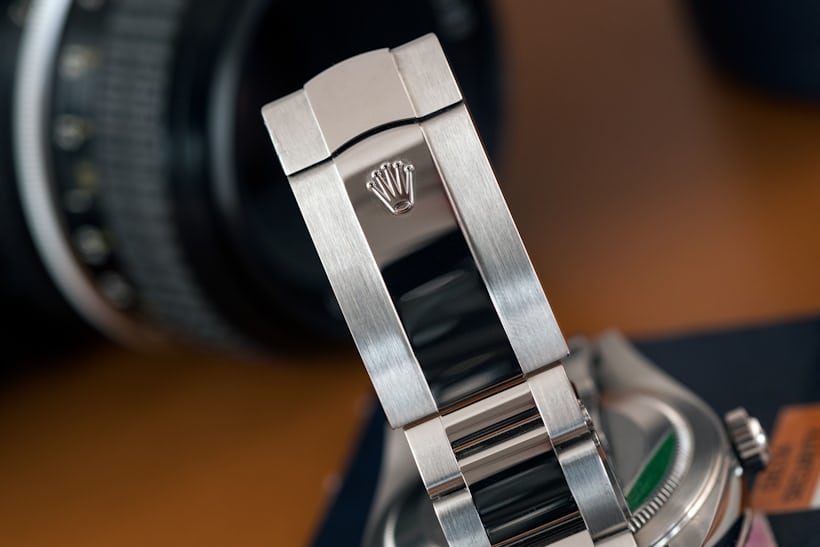 The overall fit and finish of the dial and case, by the way, is extremely good; even under magnification the dial markers, hands and numbers are all crisply defined, with irreproachable attention to detail. Rolex’s case and dial work is as uniformly excellent throughout its product lines as anything in the industry and what’s just as important, this excellence is consistent from watch to watch, and contributes greatly to the positive impression Rolex watches generally seem to make. I’m always struck by this whenever I handle one for review – even with Rolex models I wouldn’t necessarily wear on a daily basis myself, for reasons of either taste or practicality or cost, the general sense of exceptional build quality one gets is extremely high, from the humblest Oyster Perpetual to the most opulent Day-Date. One of the most essential ways in which any luxury brand can keep faith with its customers is in paying as much attention to the details in its least expensive products as in its most expensive, and Rolex is one of the very few watch companies I’ve written about over the years, for which this has always seemed to be true.