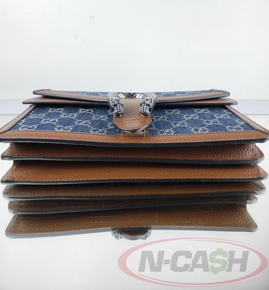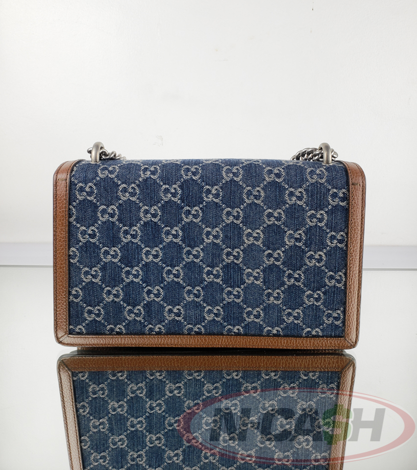 Elevate your wardrobe with this authentic Gucci Blue Small GG Denim Dionysus Shoulder Bag, a luxurious and modern take on one of Gucci’s most iconic styles. Crafted with a denim body and leather trim, this shoulder bag showcases the brand’s classic GG monogram pattern with a chic, contemporary twist. The bag features a front flap with magnetic snap closure, a detachable chain-link shoulder strap for versatile styling, and a well-organized interior with both zip and slip compartments for your essentials.