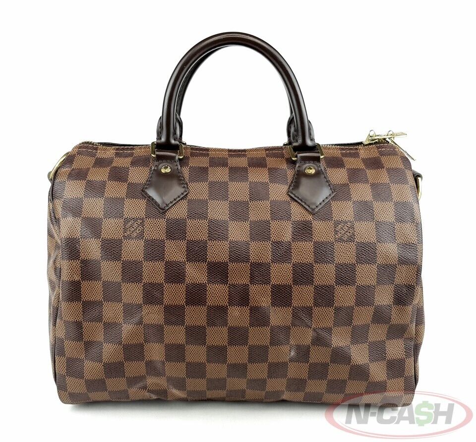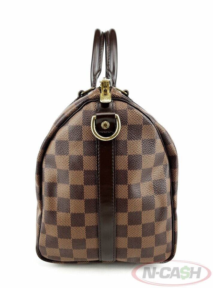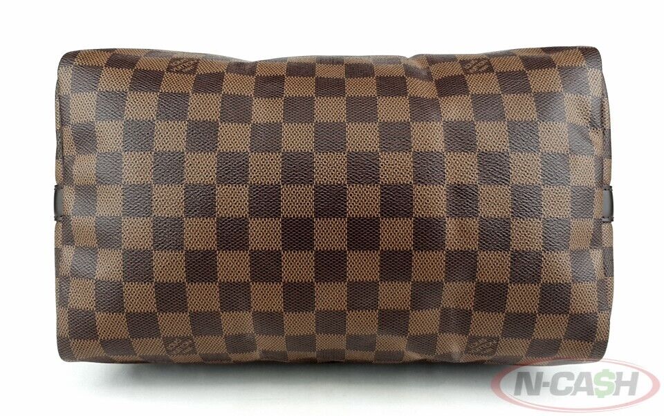 Damier Ebene canvas is in pristine condition with temporary marks from prolonged storage. Front and rear sides show handle marks as seen in photos. Fading on bottom corners, partial oxidation on hardware, and glazing wear.