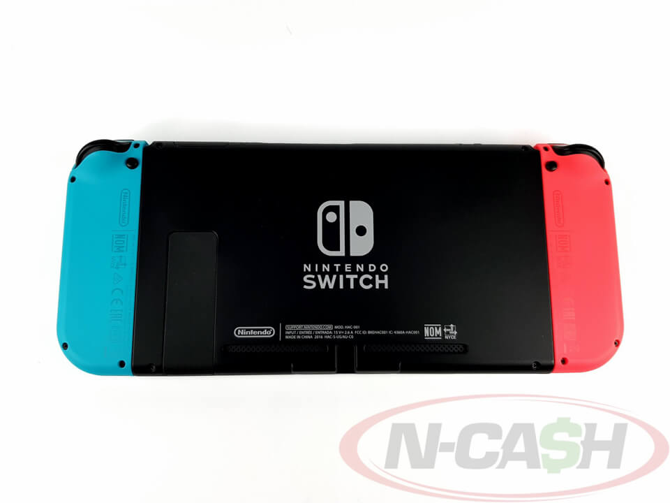 This bundle includes the Nintendo Switch console, dock, Neon Blue Joy Con (L) and Neon Red Joy Con (R), 2 Joy Con straps, 1 Joy Con grip, HDMI cable, AC adapter, and the original box.
