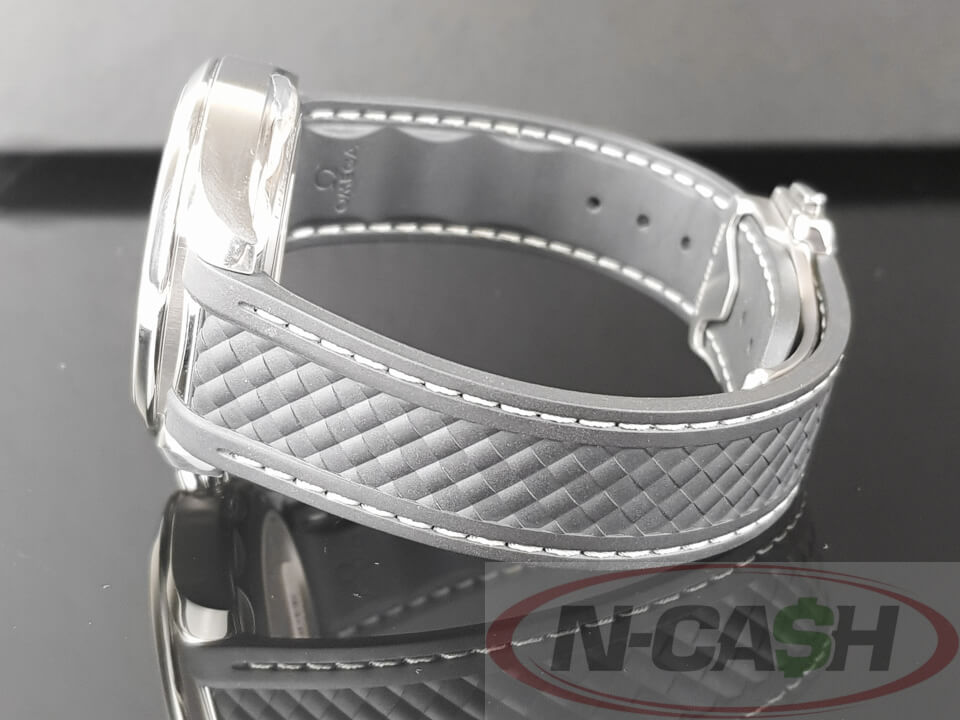 The black strap is made from structured rubber and includes grey lining and an additional stainless steel link which integrates it to the case. This certified chronometer is powered by the OMEGA Master Chronometer calibre 8900, certified at the industry’s highest standard by the Swiss Federal Institute of Metrology (METAS).