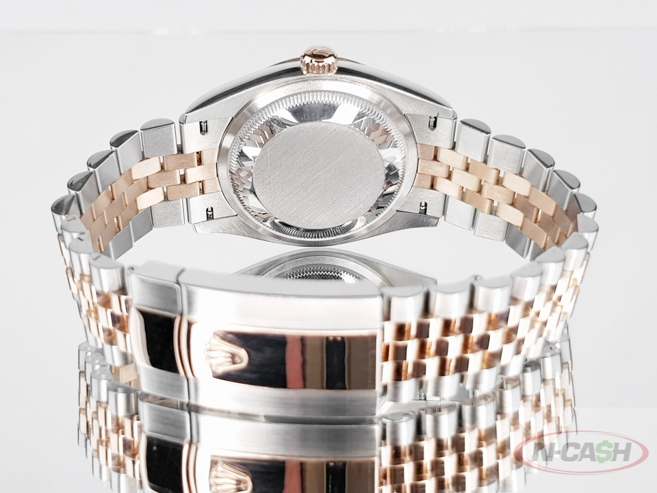 This Rolex Datejust is with polished stainless steel case and a polished 18kt everose gold Twinlock crown with two sealed zones when the crown is screwed-down: one inside the crown tube & the other inside the crown. It also features a polished 18kt everose gold fluted bezel. Adding to it the chocolate brown jubilee dial, featuring the ROLEX name repetitively embossed on the dial. 10 diamond hour markers with the Rolex Crown logo at the 12 o’clock position. Fine printed minutes/seconds track on the dial perimeter. Date window displayed at the 3 o’clock position with a cyclops magnifying lens.