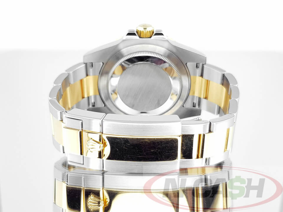 The GMT Master II ref. 116713 is the result of decades of innovative Rolex design. Its feature set includes a redesigned Oyster case with a Triplock waterproof screw-down crown, an engraved rehaut, a more robust crown guard, and wider lugs. The case, in general, wears slightly larger than its traditional 40mm diameter might suggest. The heft of the new-style case is balanced by a newer bracelet as well with more solid construction. The case and bracelet both present in a very desirable two-tone Yellow Rolesor finish of 18 karat yellow gold and 904L-grade Oystersteel. The used Rolex GMT 116713 also boasts a ceramic bezel insert, a maxi dial with larger luminous plots, and a new calibre 3186 perpetual movement with anti-magnetic technology.