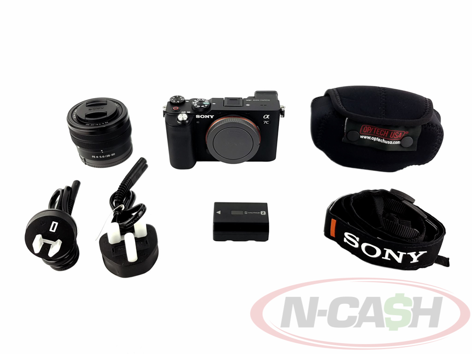 Camera comes with Sony FE 28-60mm f4-5.6 Lens, front and back lens cover, original Sony battery, shoulder strap, manuals, Optech camera pouch, and original box