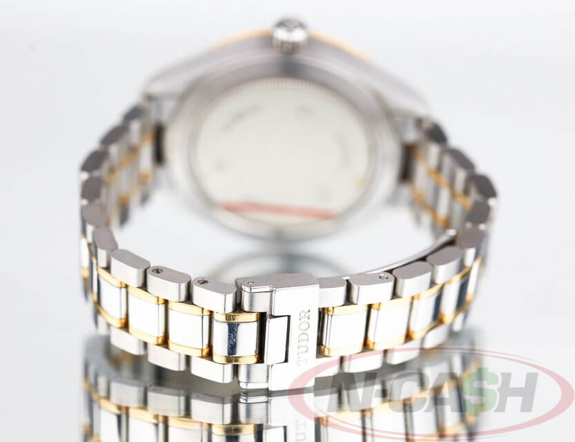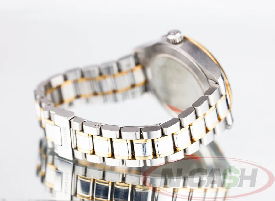 Stainless steel and 18kt yellow gold case with a stainless steel and 18kt yellow gold bracelet. Fixed stainless steel and 18kt yellow gold bezel. Champagne dial with silver-tone hands and index hour markers. Dial Type: Analog. Date display at the 3 o’clock position. Tudor Calibre 2824 automatic movement with a 38-hour power reserve. Scratch resistant mineral crystal. Screw down crown. Solid case back. Case size: 38 mm. Round case shape. Water resistant at 100 meters / 330 feet. Functions: date, hour, minute, second. Dress watch style. Watch label: Swiss Made. Tudor Style Champagne Dial Automatic Steel and 18kt Yellow Gold Mens Watch 12503-0001.